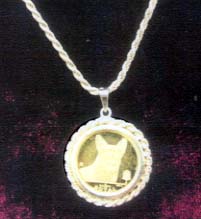 14 K Gold Coin Necklace of the Pembroke Welsh Corgi with 14K gold 23 inch rope chain. Elizabeth II, Gibraltar 1991 With profile of Elizabeth on back "Royal .001 oz. 999.9" with Corgi face on front. |